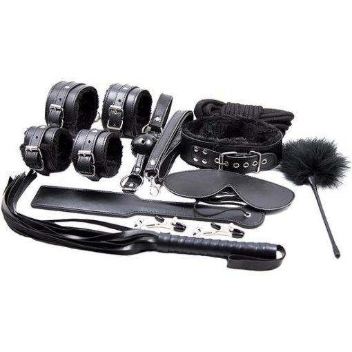 BLAZE ULTIMATE BONDAGE SET. Este juego de bondage Blaze es el juego de bondage definitivo para principiantes, que contiene 10 artículos: Esposas para muñecas Esposas para tobillos Máscara Pala Flogger Plumero Ticler Collar con correa Bozal para la boca Pinzas para los pezones Cuerda Las esposas para muñecas y tobillos y el collar están forrados con una suave imitación de piel para un aspecto lujoso y una comodidad de uso. El tamaño se puede ajustar con los cierres de hebilla metálica. La correa de aspecto de cuero se puede conectar al collar mediante un gancho mosquetón y una anilla D. El bozal para la boca se puede ajustar con una hebilla en la correa del cuello, la bola es suave, insípida y sin olor, y se mantiene cómoda de llevar gracias a los agujeros de respiración. Una cubierta de PVC en las puntas de las pinzas metálicas para los pezones protege la piel. La presión se puede ajustar con los tornillos, para un control óptimo de la presión. Con este juego de bondage es posible disfrutar de muchas situaciones y posiciones BDSM diferentes. Los principiantes pueden conocer el juego de bondage y descubrir la emoción que los juegos de amo y sumiso pueden traer. Los amantes BDSM más experimentados encontrarán todo lo que necesitan en este conjunto para una buena sesión de bondage. Use el conjunto con cuidado y nunca deje a una persona atada sin supervisión.. Medidas de la caja: 30,5 x 35,5 x 7. Longitud del producto en cm.: . Color: Negro. Material: Polyurethane / Polyester / Neopren / ABS / PVC