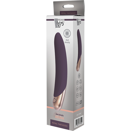 ROYAL FANTASIES ASTERIA. El Asteria es un vibrador elegante hecho de silicona suave y ABS, con una base de aspecto metálico brillante. El eje liso tiene una punta ligeramente flexible y una forma curvada, lo que es excelente para la estimulación del punto G. Una característica especial de este vibrador es la densidad dual, lo que significa que el núcleo es duro y el exterior del vibrador es más suave. Esto hace que el juguete se sienta como si fuera real. El potente motor ofrece 3 niveles de vibración constante y 7 ritmos diferentes. Vibrador hecho con eje liso Densidad dual 1 Motor potente 10 patrones de vibración Botón de control de un solo toque resistente al agua IPX7 Recargable por USB con imán, tiempo de carga 3 horas Hecho de silicona y ABS seguros para el cuerpo Libre de ftalatos Dimensiones: diámetro 3,9 cm, longitud 21 cm Haga clic aquí para descargar el manual.. Medidas de la caja: 27 x 7 x 5. Longitud del producto en cm.: 21. Color: Púrpura. Material: Silicone / ABS